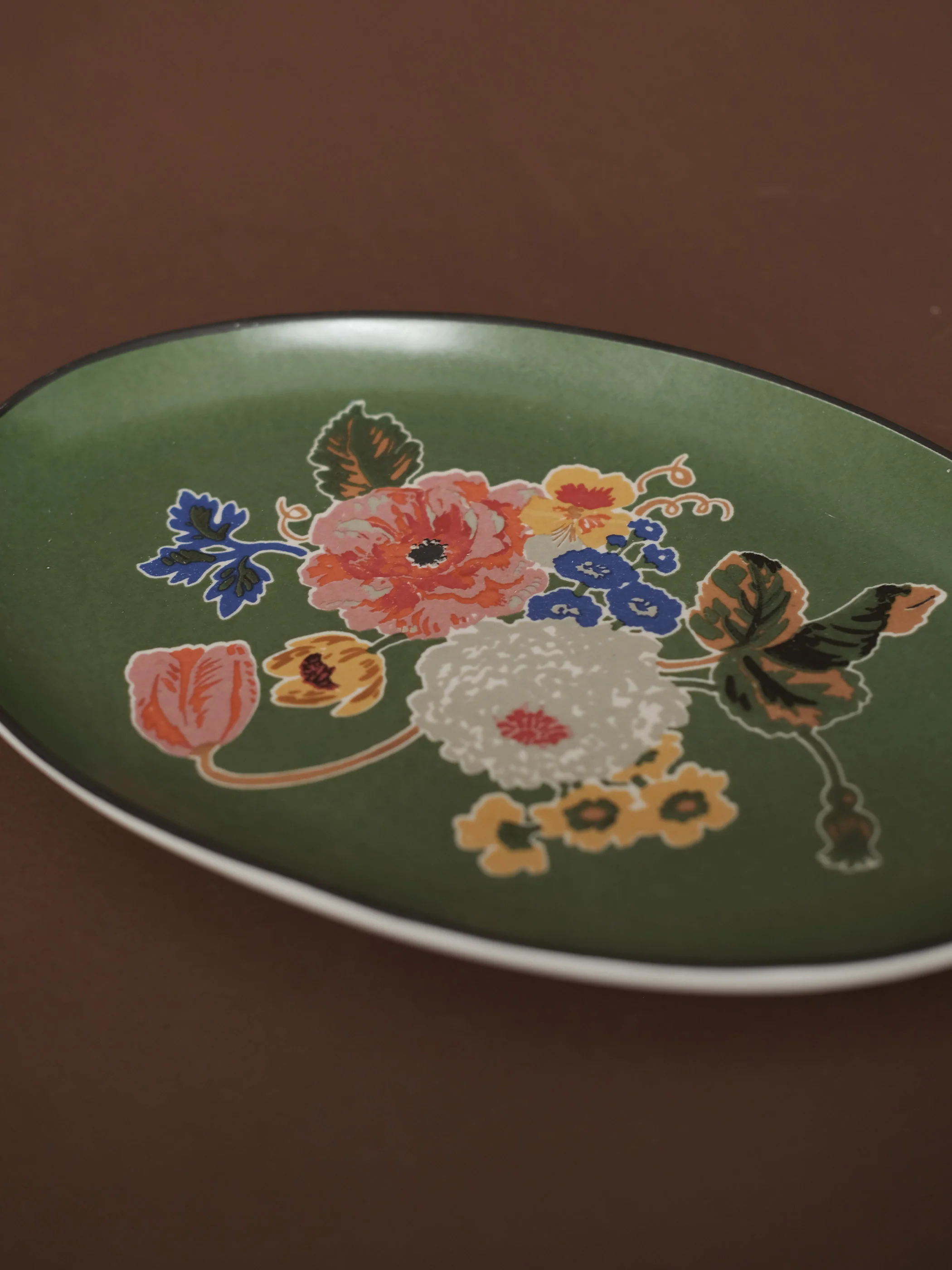 A big serving of a botanical composition against a solid green base. One of our more colourful pieces that works just as well for coffee table decor.